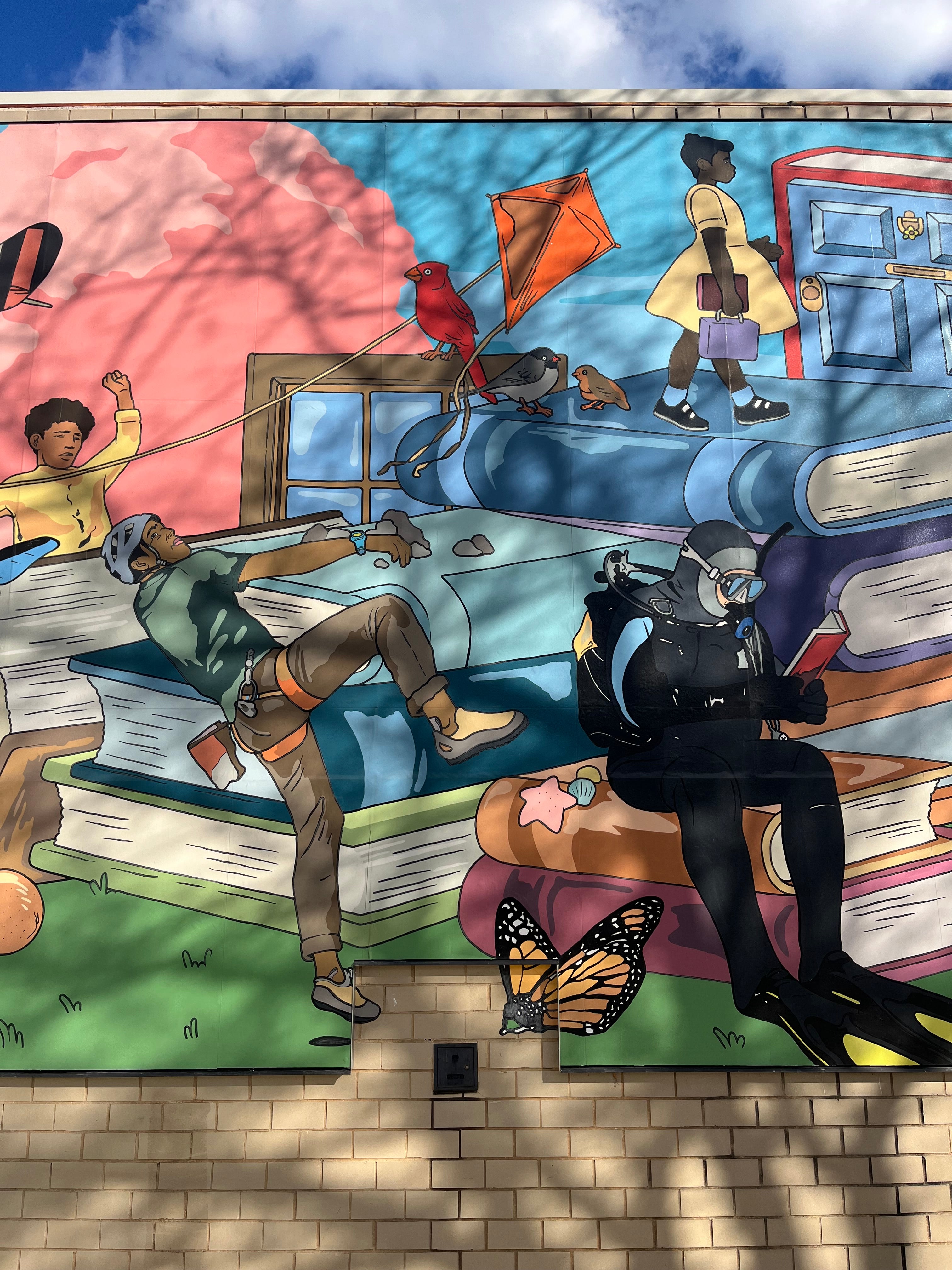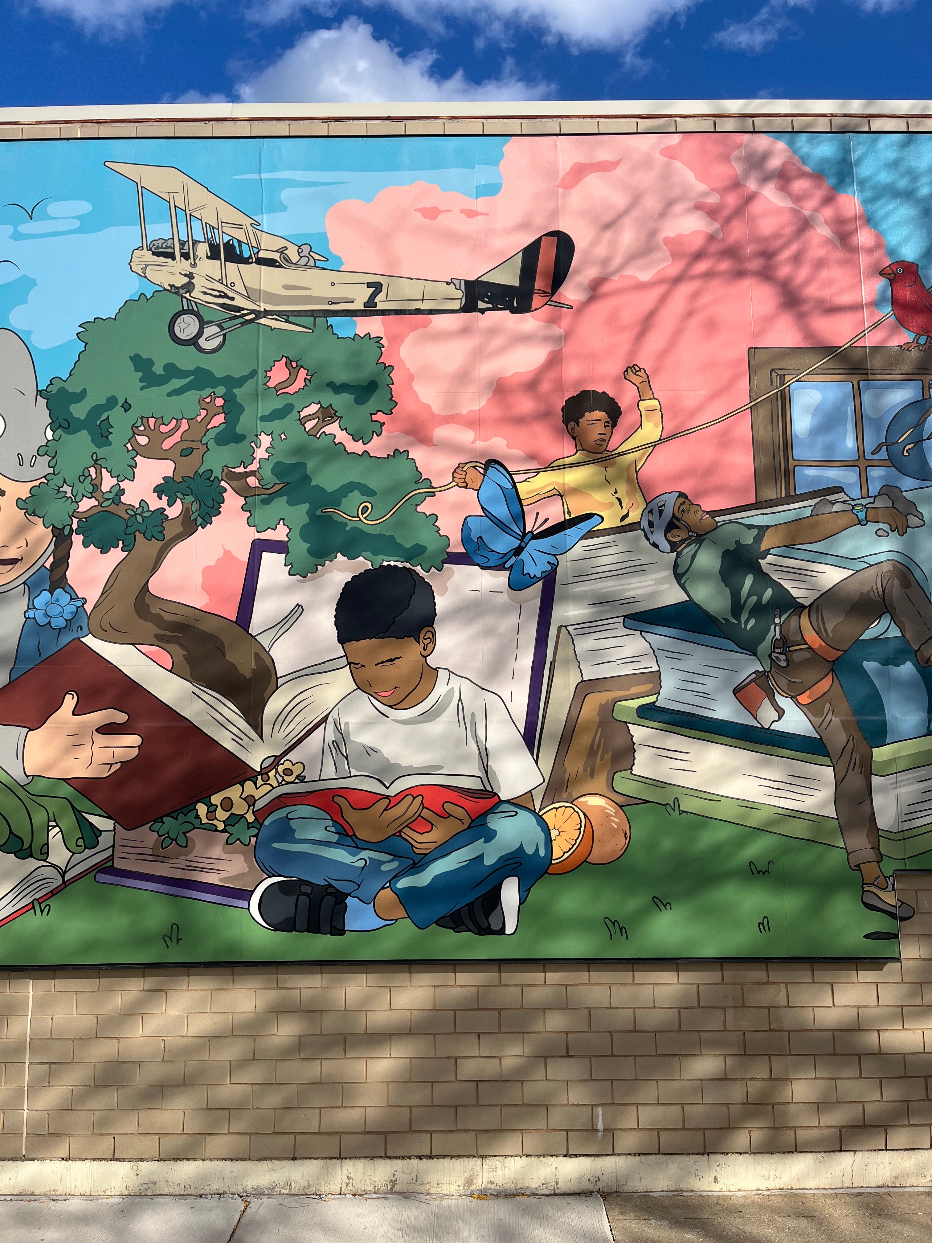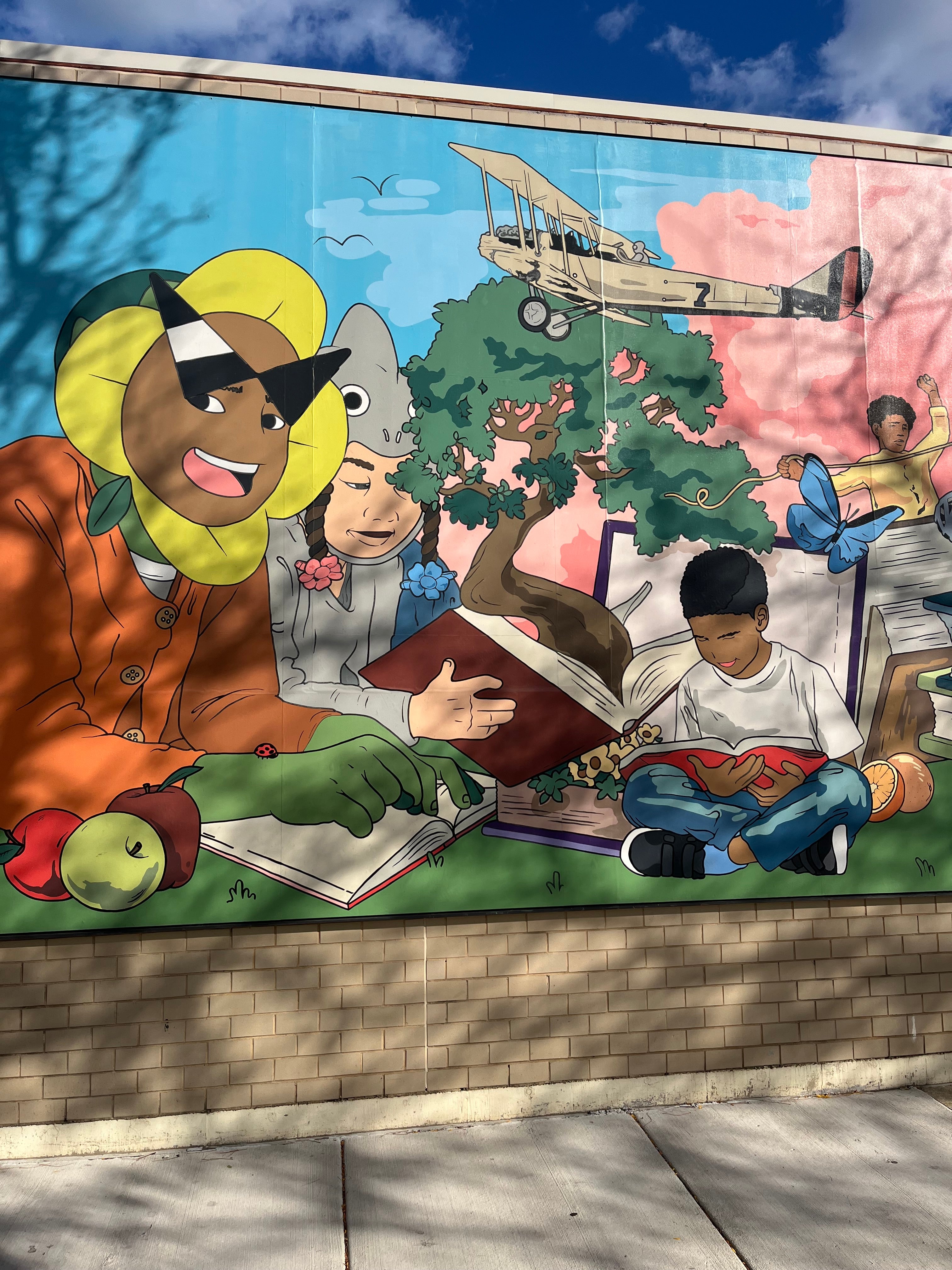 “Beyond the Pages” Mural painted for The Bessie Coleman Branch Library, Chicago Public Library’s. Featuring the world of petalhead is located at 731 E 63rd St, Chicago, IL 60637.